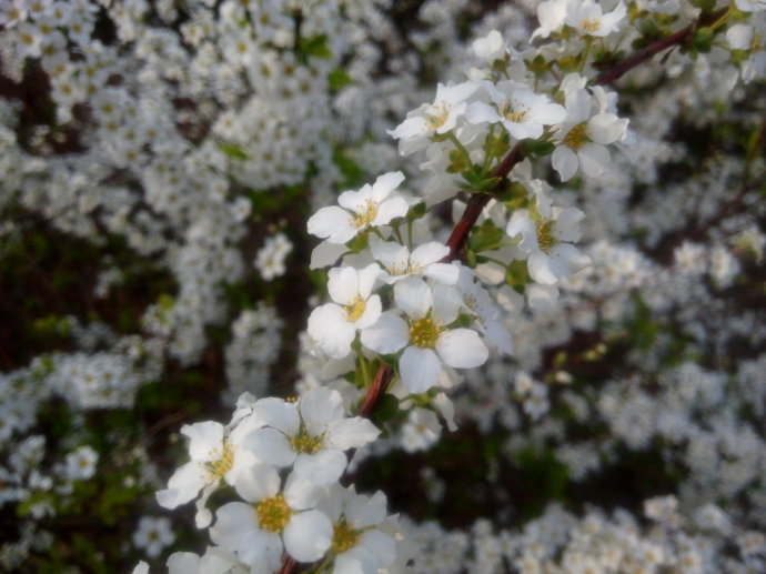 一直喜欢叫它喷雪花,而不是珍珠绣线菊什么的,它是开在万紫千红的春天里最热闹的时刻,这个时候,第一拨儿的梅花呀、玉兰呀、杏花呀、红叶李呀什么的已经开过去了,金钟呀,连翘呀,还有各种的桃花、梨花、榆叶梅、海棠花……赶着趟地拥挤过来,如T台上的选美大赛,乱哄哄的,只顾着争奇斗艳。放眼一望,满天满地都是花红柳绿,姹紫千红,任凭你趔趄着腿儿使劲地赶着趟,眨巴着眼睛使劲地东张西望也是看不过来了,这个时候,喷雪花开了,如白雪压枝,一片一片的,开在和煦的春风里,这是阳春里的白雪呀,那份高洁和简约,是另类的惊艳,唬得闹嚷嚷的百花全都噤了声……