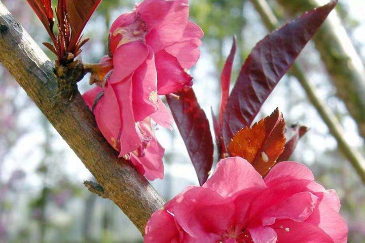红叶碧桃:属于落叶小乔木,树皮主要为灰褐色,小枝为红褐色,单叶互生。新叶为鲜红色,而后转变成为深紫红色。从5月下旬开始,枝叶逐步转变成为绿色。叶片形状为卵圆状披针形,叶缘处有锯齿。