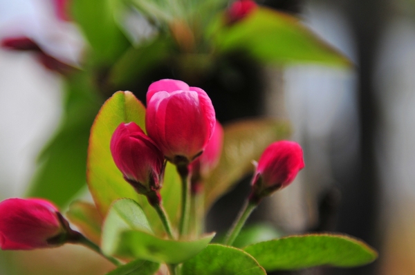 在花朵刚刚开放的时候,呈现的是胭脂红色,接下来随着天气逐渐变暖,花朵就成为了娇艳的红色,而等到西服海棠完全盛开的时候,颜色就会慢慢的褪去,从美丽的最红色变成了淡粉色,最后变为了粉白色,如果形象的比喻一下,就像是一个女生上妆又卸妆的过程。